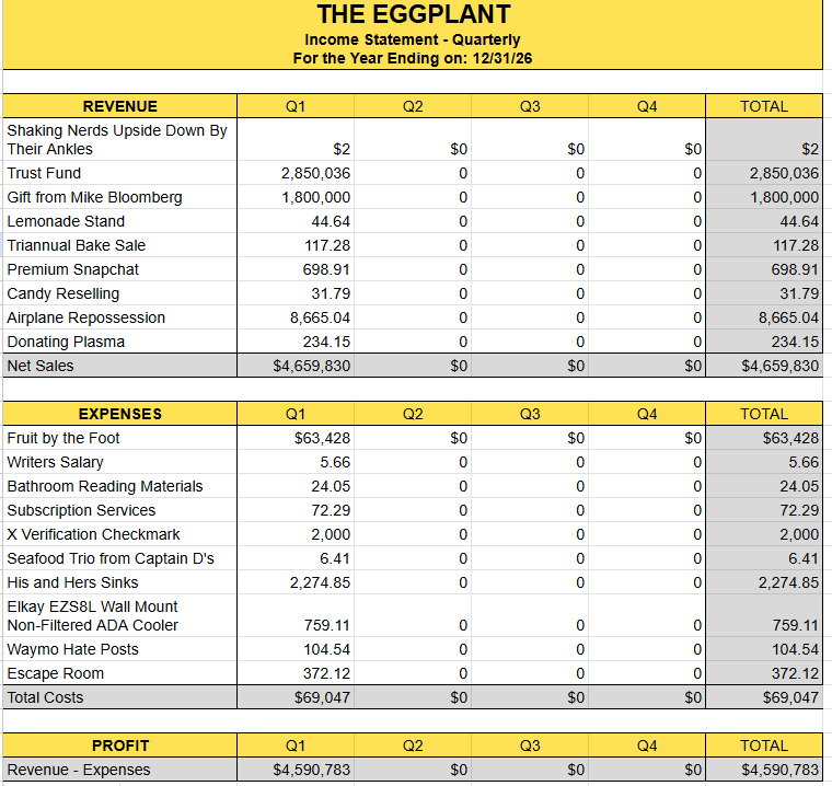 Eggplant Quarterly Financial Report Pictured is the Eggplant’s 2026 Q1 Financial Report. The Eggplant FSUApril 14, 2026 Facebook0 Twitter LinkedIn0 Reddit Tumblr Pinterest0 0 Likes